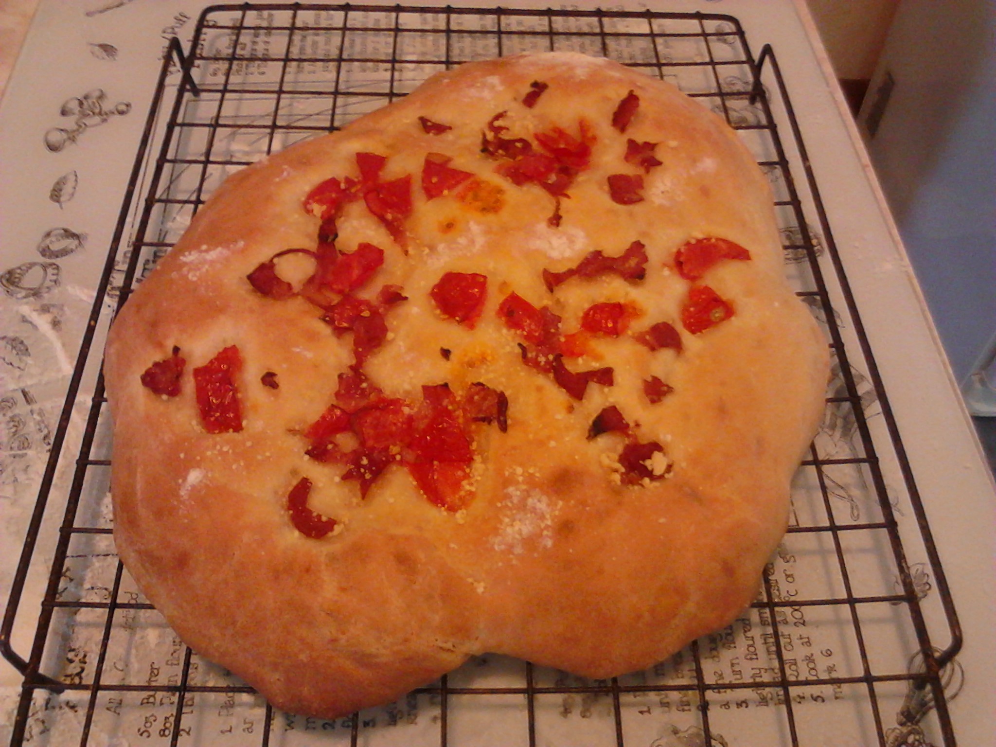 After the second rising I added chopped bacon and chopped tomato and dusted it all with ground parmesan. If it looks a bit “rustic”, some visitors arrived as I cooking so I was short of time, but I reckon it looks pretty good anyway!