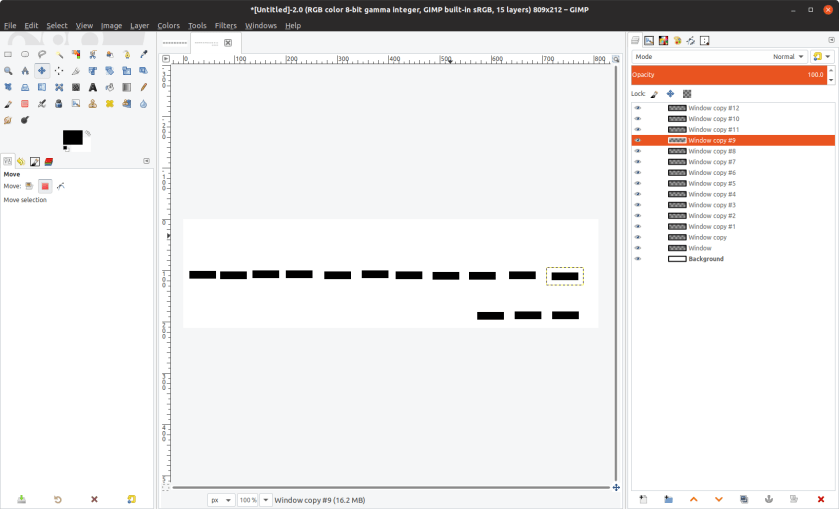 As you can see, they are not exactly aligned and spaced, so that was my next task, using the alignment tool. I wanted this middle row to to be evenly spread along the mid line of the image, so in the alignment tool properties dialog I selected “Relative to Active layer”. Then I selected all the layers on the middle line, and finally selected the Background layer. I selected the button to align the layers on the mid line of the image (the lower middle of the six buttons in the “Align” section) then I selected the button to distribute the layers evenly across the image (the one on the right of the first row of the “Distribution” section). Now the image looked like this :