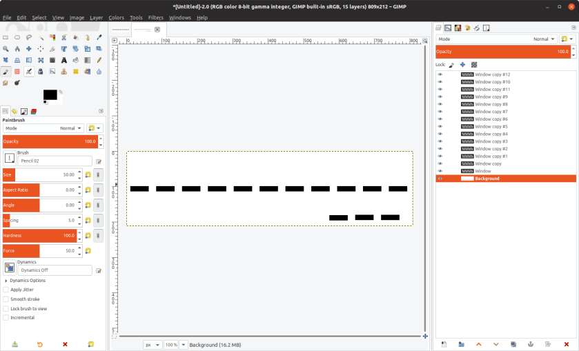 I wanted to have two chains of windows encircling the UFO, so the next step was to create a small layer for a single window. There are many ways to create a new layer, and I’m not going to go into details of all the methods. Please read the Gimp documentation if you want to know more.