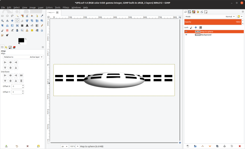 My main idea was to create the UFO as a rectangular image, and then to use the “Map Object” filter that comes with the GIMP to wrap this image around a sphere. So, first I created a rectangular image, four to five times as wide as it was high.