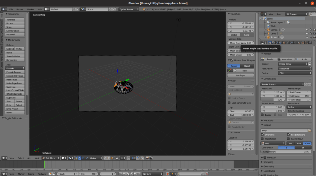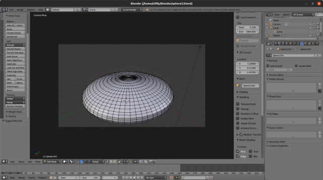 I continued to familiarise myself with the Blender interface by playing around with house models, and then I decided to try to recreate my UFO from the GIMP in blender. Here it is, in Blender. Unfortunately, the image is quite small.