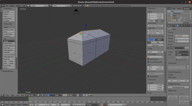 As you can see, I forgot to create the eaves, but apart from that I managed to recreate something like the tutorial model. I should have planned the house properly before I started it. I could correct it in Blender, but it is easier, with such a simple model, to start again.