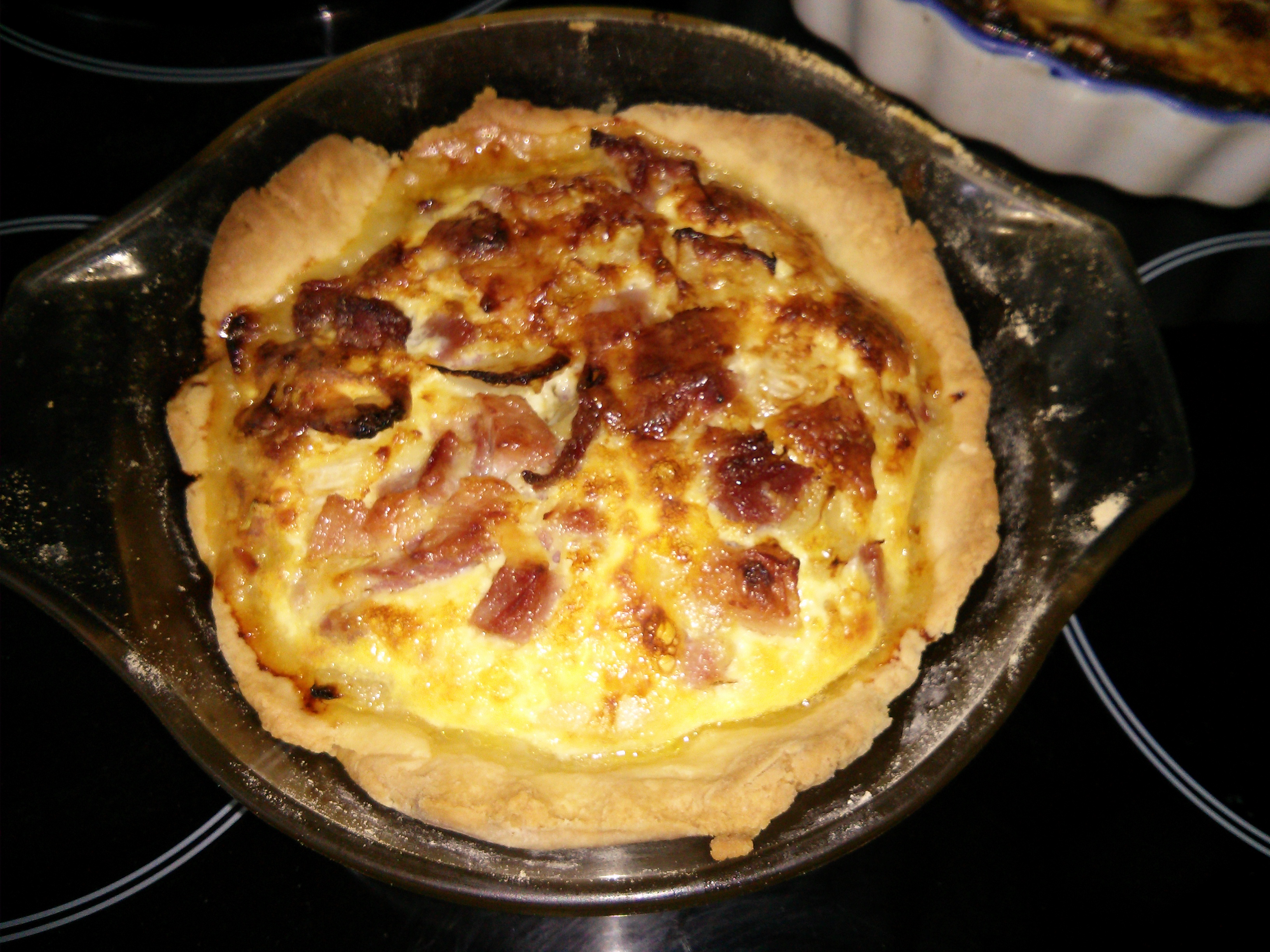 While that was cooking I grabbed a smaller dish and made some more pastry to line it. Half of the above quantities was enough and I put the pastry in the oven with the first quiche for 15 minutes. Again it came out OK, and I filled it with the rest of the mixtures and they filled nicely, so into the oven it went. At this stage I managed to burn myself a little on one of the oven racks.